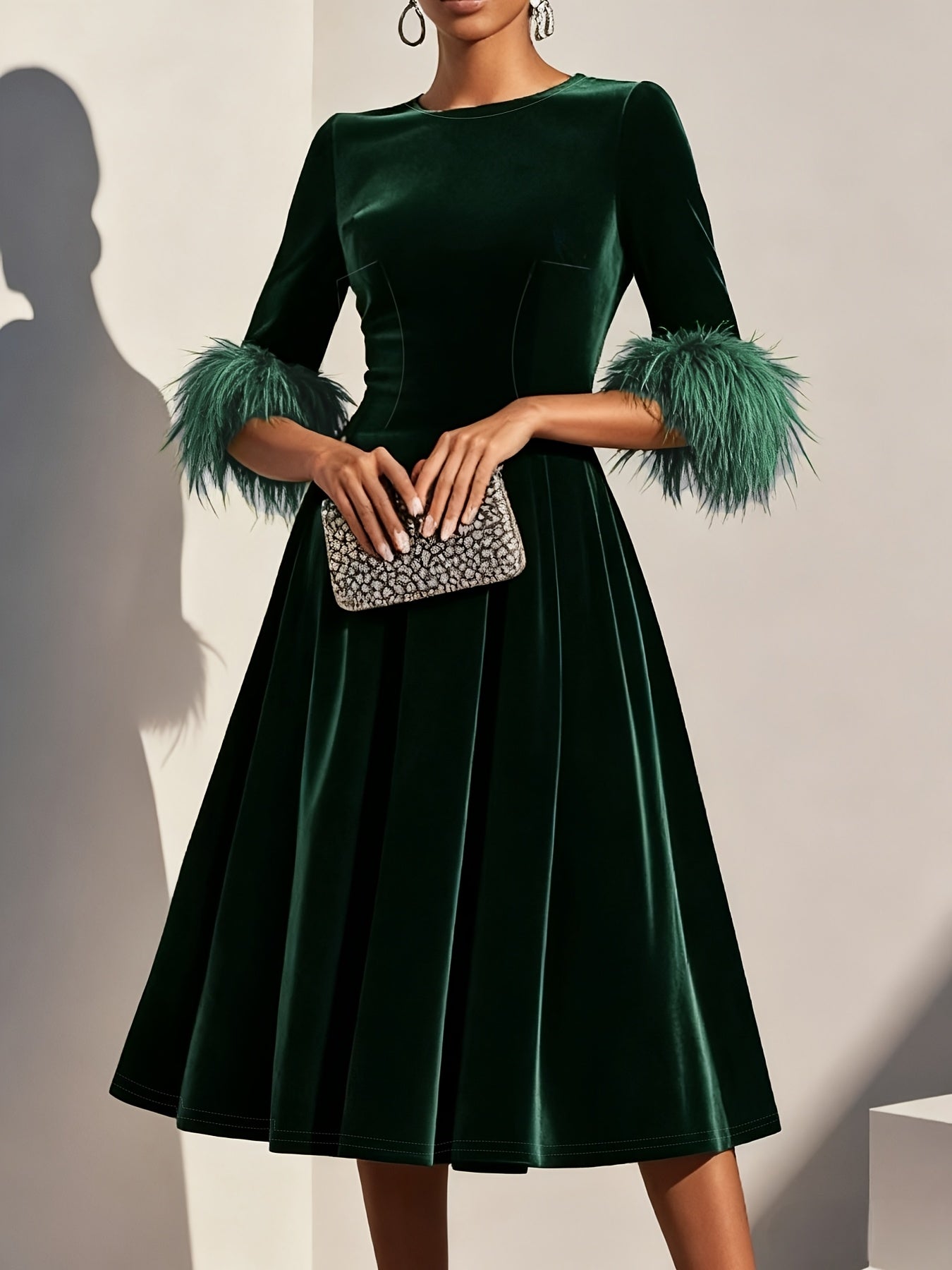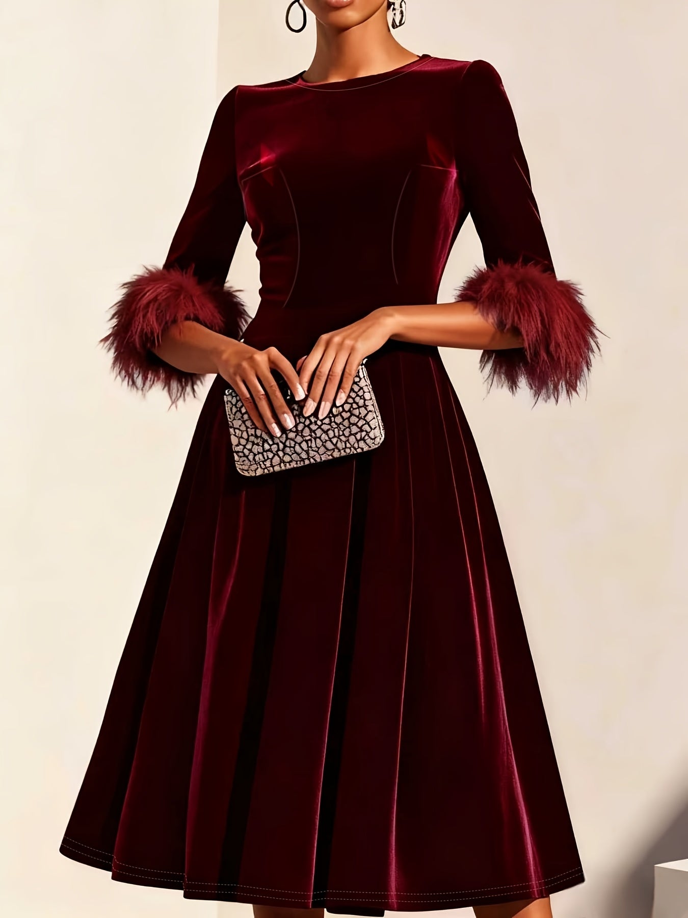 Ember - Luxe Velvet Midi Dress with Feather Cuffs